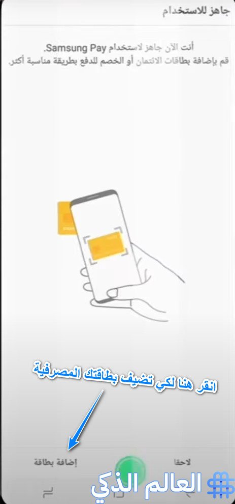 لإضافة بطاقتك افتح تطبيق سامسونج باي واضغط على إضافة بطاقة ثم أدخل معلومات البطاقة يدويًا أو امسحها بالكاميرا وأكدها برمز التحقق من البنك.