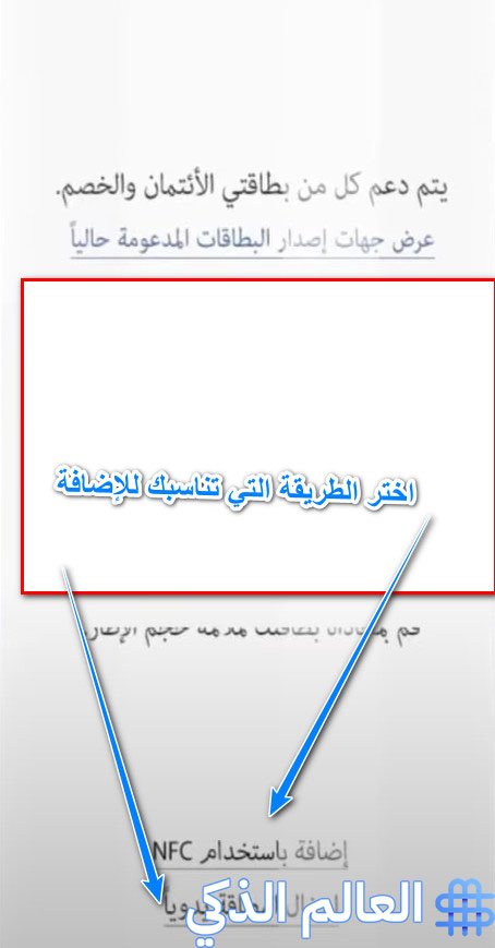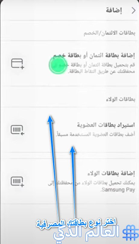 - انقر على إضافة بطاقة وبعد ذلك اختر نوع البطاقة التي تود إضافتها لكي تتمكن من إدخالها في التطبيق.
