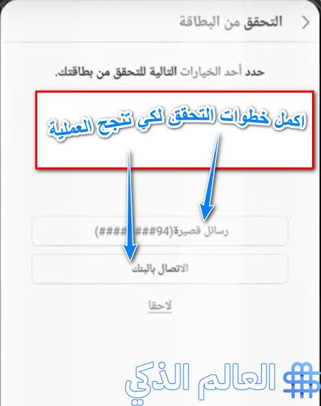 - أكمل خطوات التحقق من بطاقتك المصرفية وبعد ذلك يمكنك استخدامها عن طريق الخدمة في أي وقت.