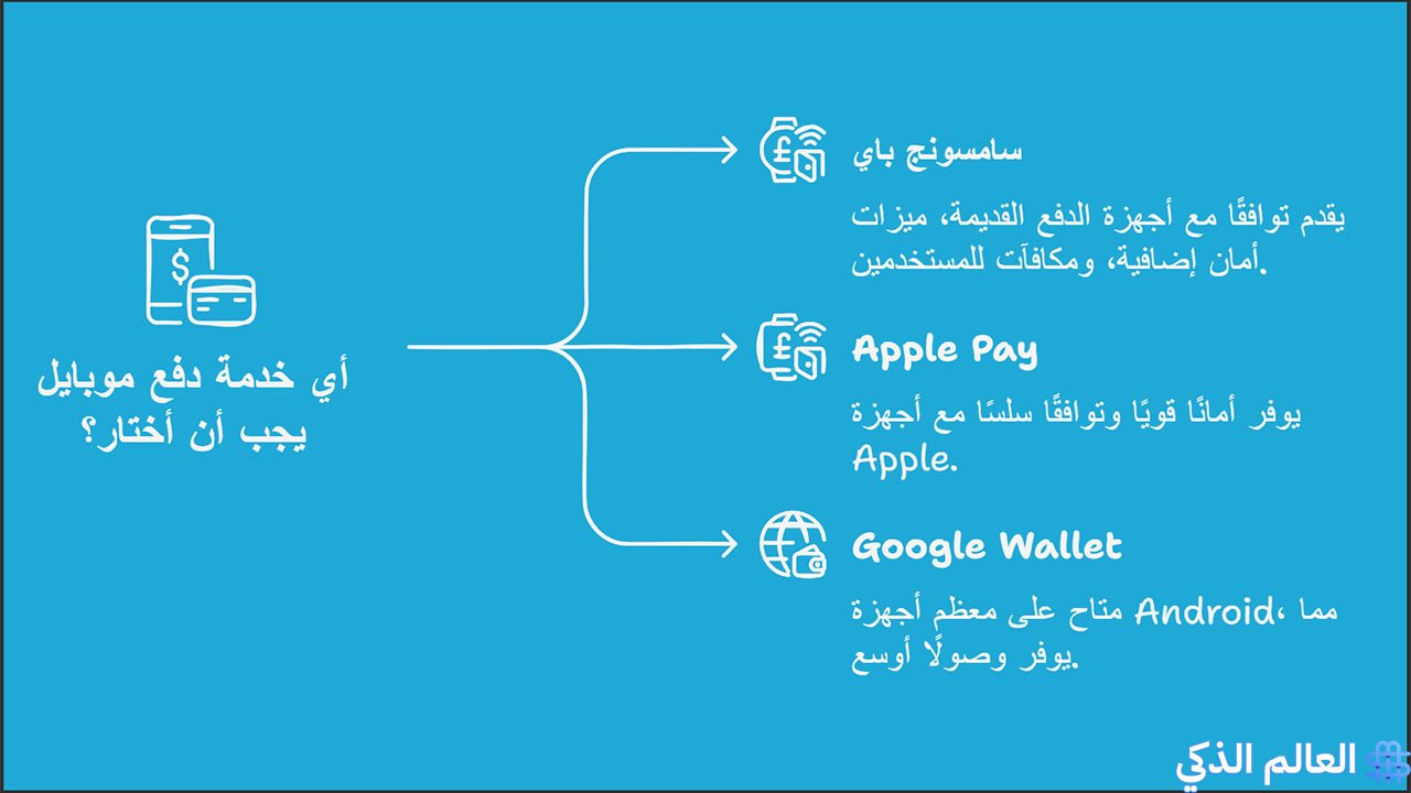 - التوافر على الأجهزة:- سامسونج باي متاحة فقط على أجهزة Samsung المدعومة و Apple Pay متاحة فقط على أجهزة Apple. بينما Google Wallet متاحة على معظم أجهزة أندرويد مما يجعلها الأكثر انتشارًا بين المستخدمين.